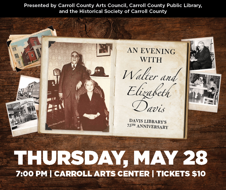 Join Carroll County Public Library, Carroll County Arts Council, and the Historical Society of Carroll County as we celebrate the Davis Library’s 75th anniversary on Thursday, May 28th at 7 pm. We will welcome everyone to the Carroll County Arts Council for an Evening with Walter and Elizabeth Davis brought to life by actors Gayle Turner and Darci Tucker.